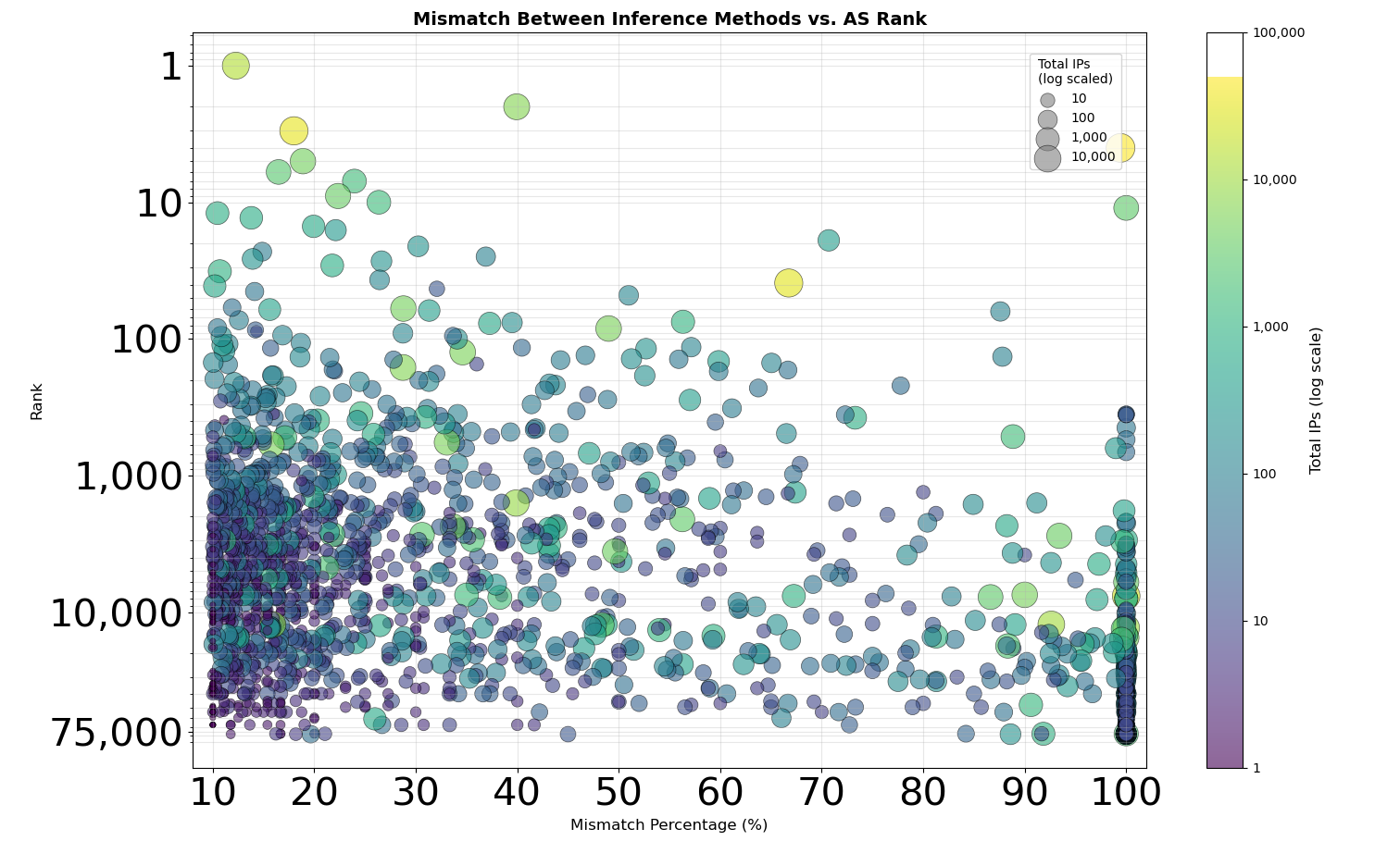 To understand where anomalies exist, I compared IPinfo's existing IP-to-AS mappings with the inference algorithm’s results. I visualized the data quality issues using bubble plots, where the X-axis shows the percentage of missing or mismatched data, the Y-axis shows AS Rank (a measure of network size and importance based on how many customer networks depend on it), and bubble size represents the number of affected IP addresses.