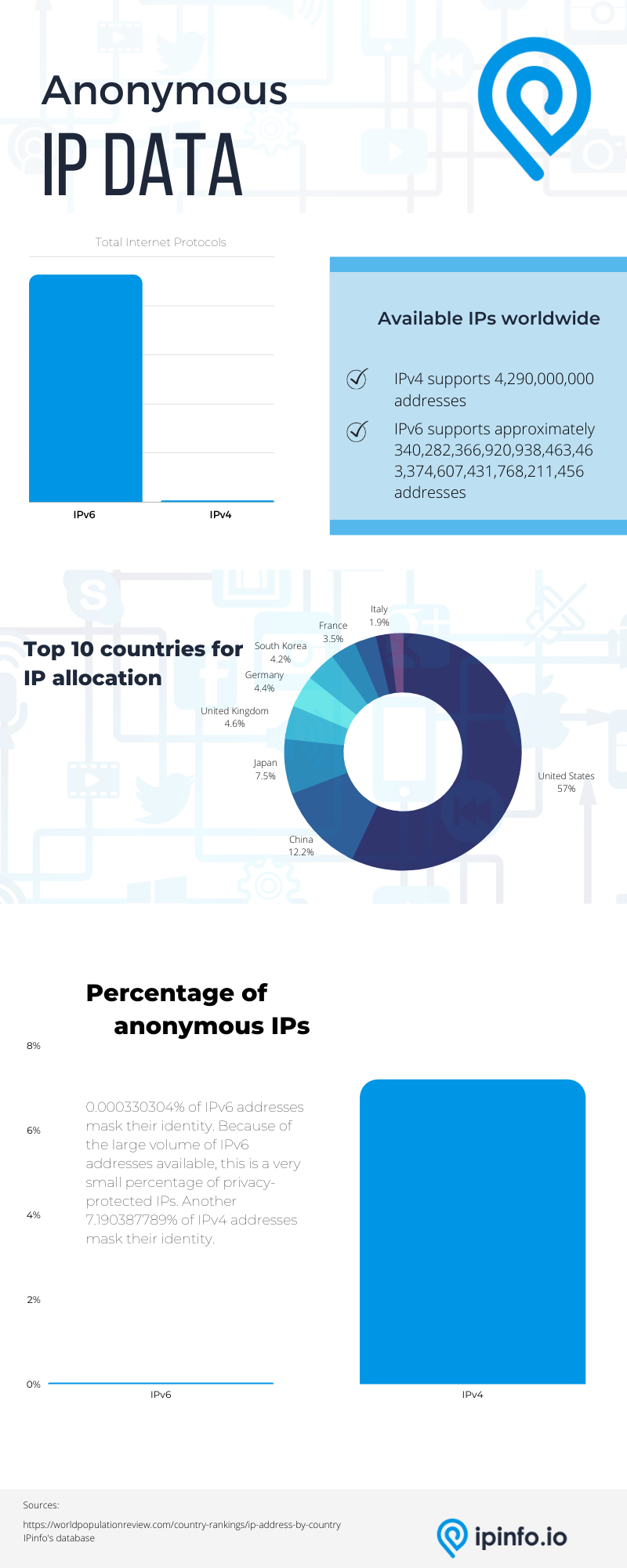 Within our IPv4 and IPv6 databases, we noticed a few interesting trends. For starters, the total number of privacy-protected IPv4 addresses is around 308,824,000 that is 7,19% of the IPv4 database. In comparison, 0.00033% of IPv6 addresses mask their identity.