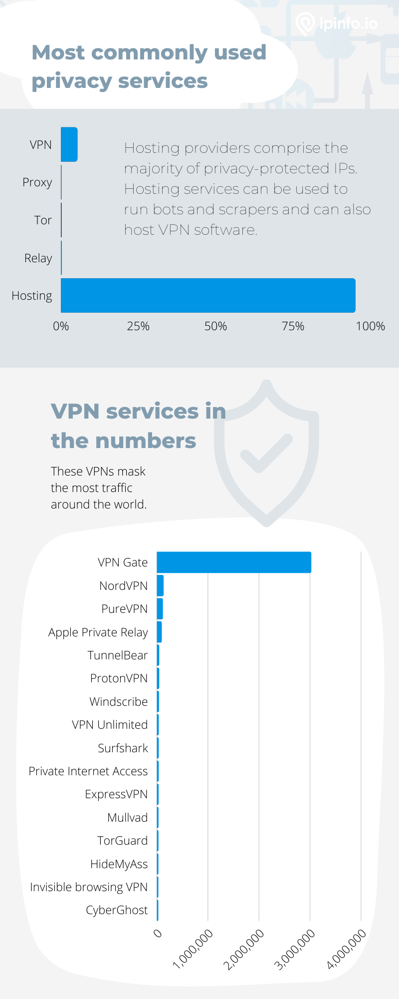 Our metrics also showed that APR is in the top four privacy protection services. This is notable since APR has only been around for a short time. In fact, back in October, IPinfo's data experts began tracking a growing percentage of Apple Private Relay users.