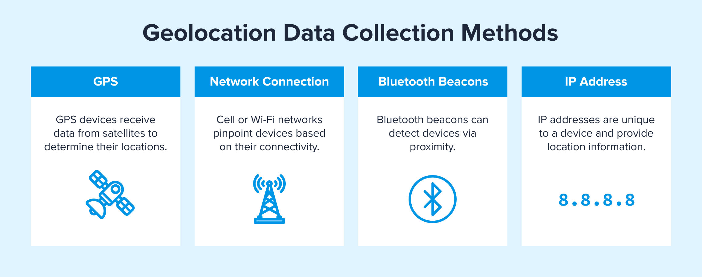 IP addresses can also be used to determine geolocation, but the collection methodology is different, traditionally relying on generic self-published location data (such as WHOIS and geofeed), which is unregulated and provided voluntarily by ASNs. The most reliable IP geolocation providers offer additional data collection and validation processes to ensure geolocation accuracy.