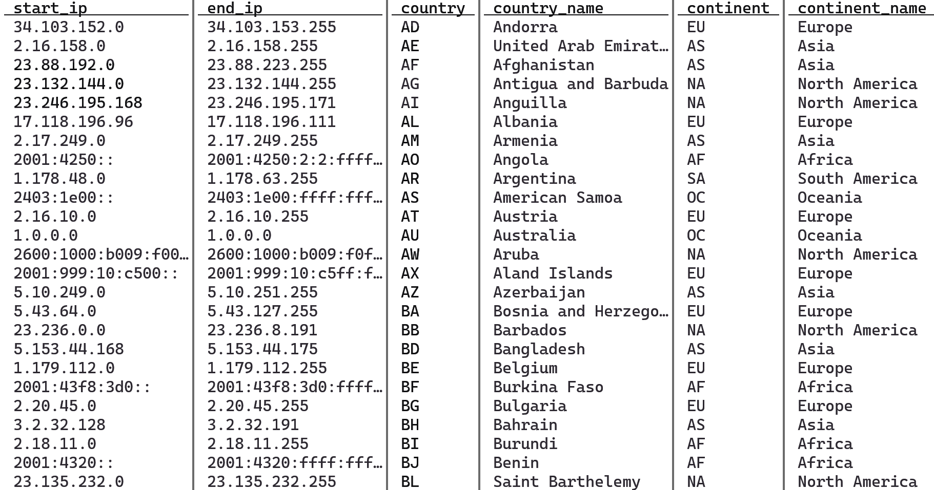Sign up for freeOur API returns ISO-2 country codes instead of country names. Here you can see it returning "US" for a google IP: