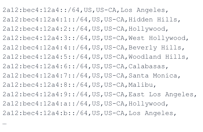 For readers less familiar, geofeeds are typically CSV files that map IP prefixes to geographic locations. The location may be expressed at different levels of granularity, including: