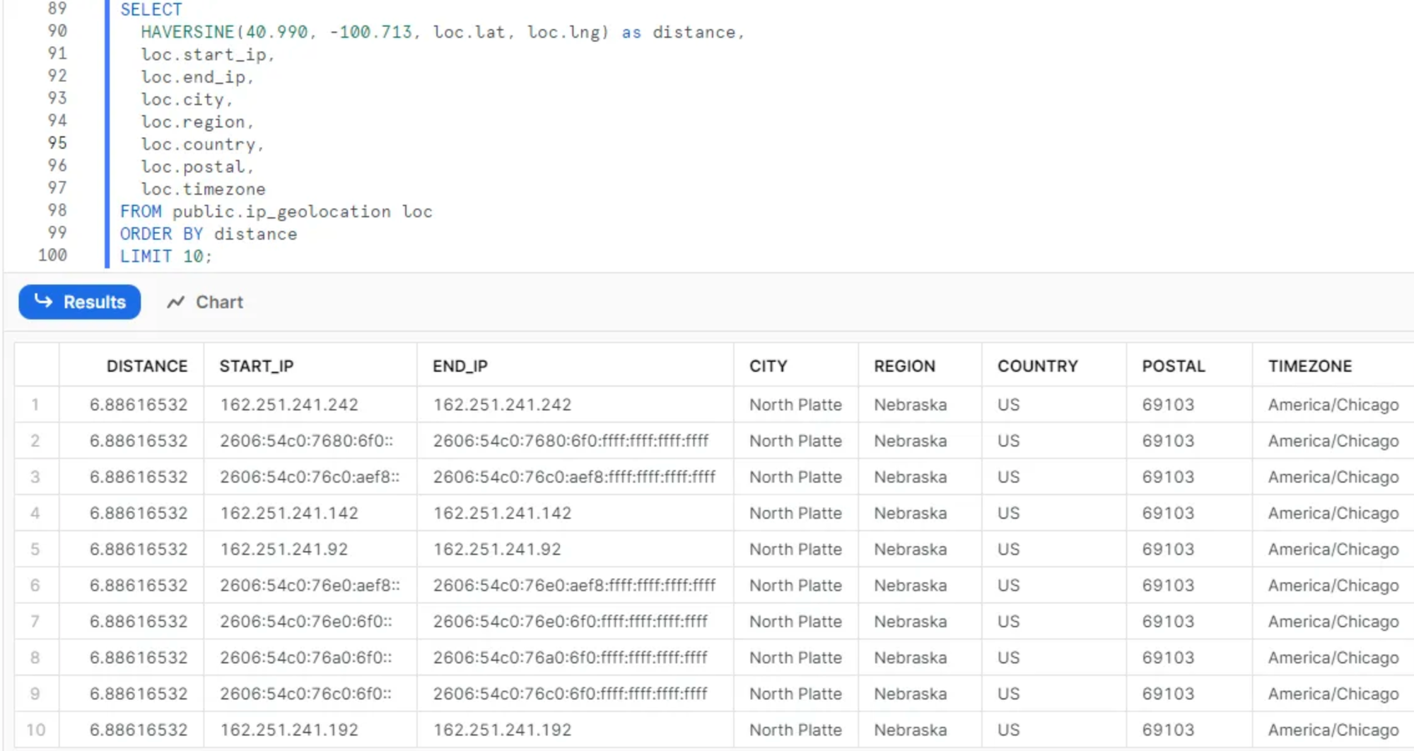 This can be done through our IP to geolocation data in Snowflake. The Snowflake marketplace has a native Haversine formula that can be used with our IP address to geolocation data available on the Snowflake Marketplace.