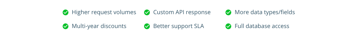 We also offer solutions for businesses who regularly exceed 1 million lookups per month, who have custom data needs, or who have other special requirements.