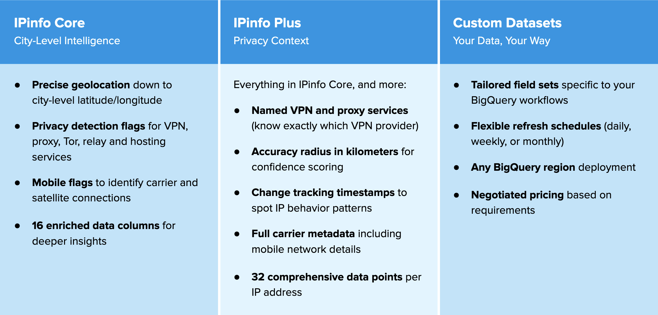That same dataset is now available as IPinfo Lite, and it’s joined by two new production-ready datasets: IPinfo Core and IPinfo Plus, as well as Custom Datasets that we tailor on request for specific data needs, regions, or refresh cadences. Together, these options provide developers with far greater depth and flexibility to enrich IP addresses found in web traffic logs, security events, analytics tables, and any other workload that lands in BigQuery, and to act on that context in place.