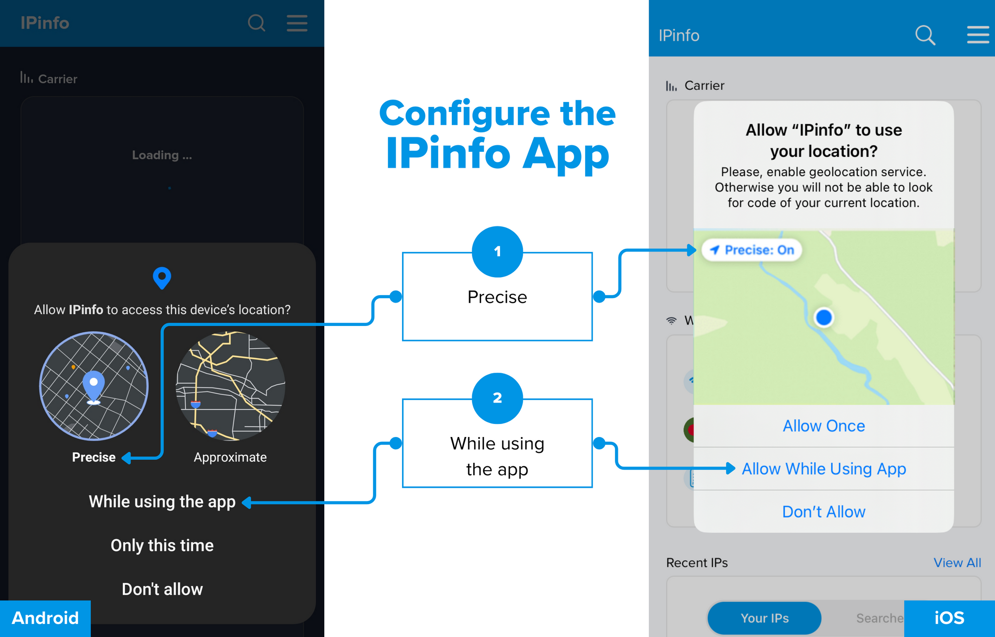For the Android app, after you install and first open the app, you will be prompted with the location permission section. Please do the following: