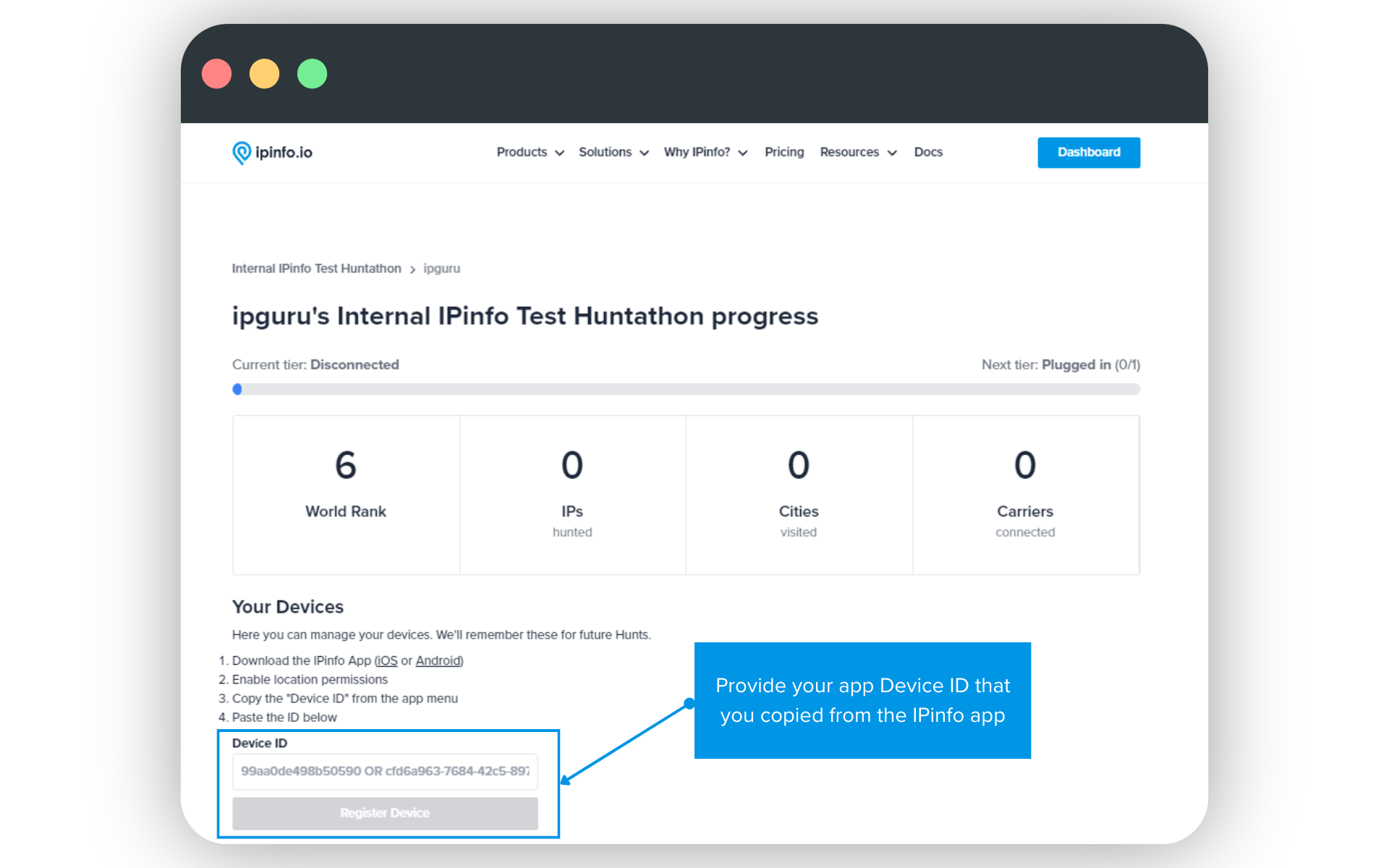 After you have set your userame, you will be prompted to add your Device ID. The Device ID connects your app's activity with your account. Through the Device ID linking mechanism, every IP address you hunt will be added to your profile.