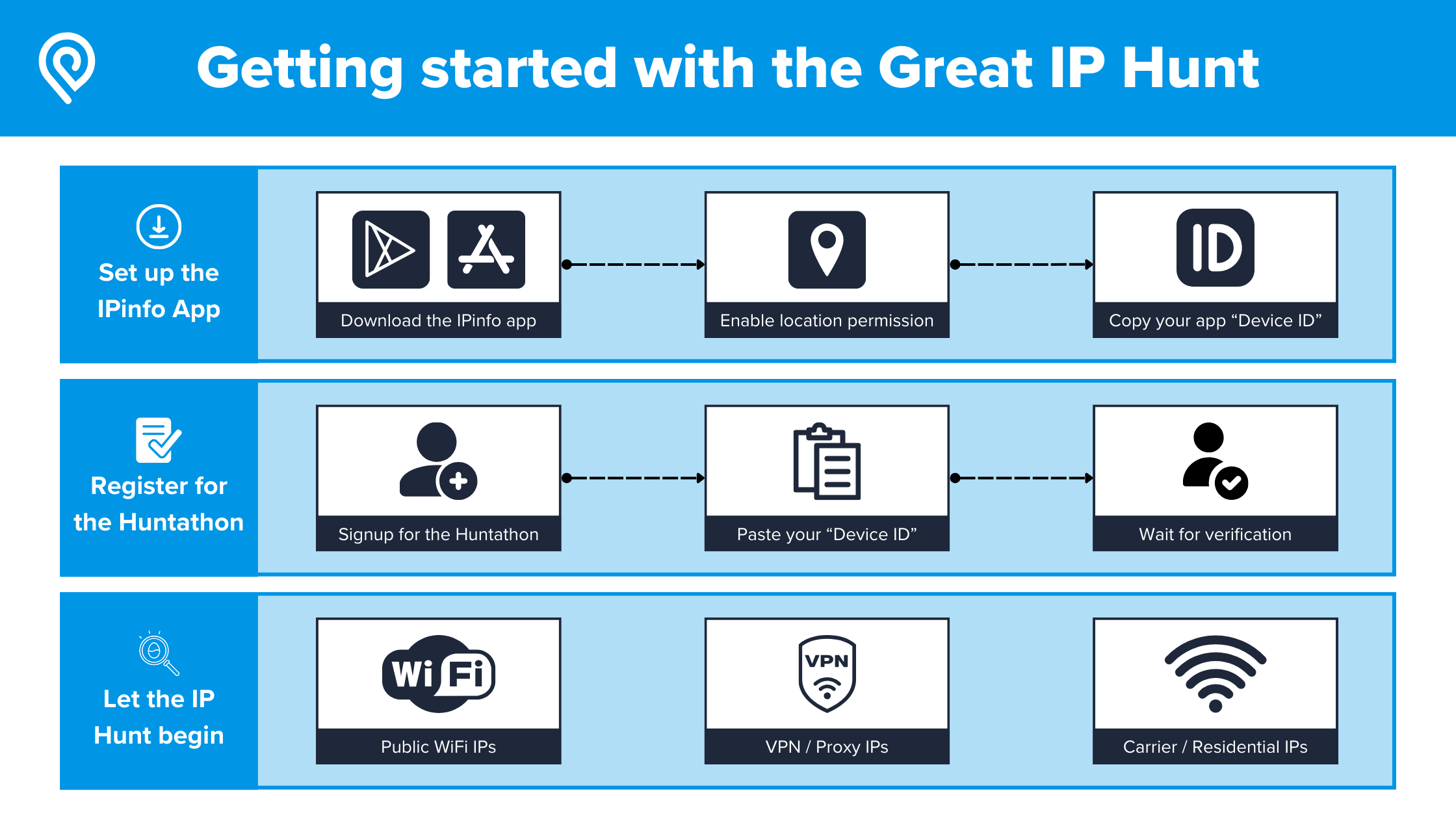Sign up for freeWe at IPinfo are very excited to announce our first community “huntathon” event: The Great IP Hunt. This event celebrates the idea of learning about IP address geolocation in a fun and engaging way. You can run around and collect unique IP addresses, hunt their IP geolocation using our brand-new IPinfo apps (Android and iOS), and submit them to win daily prizes.