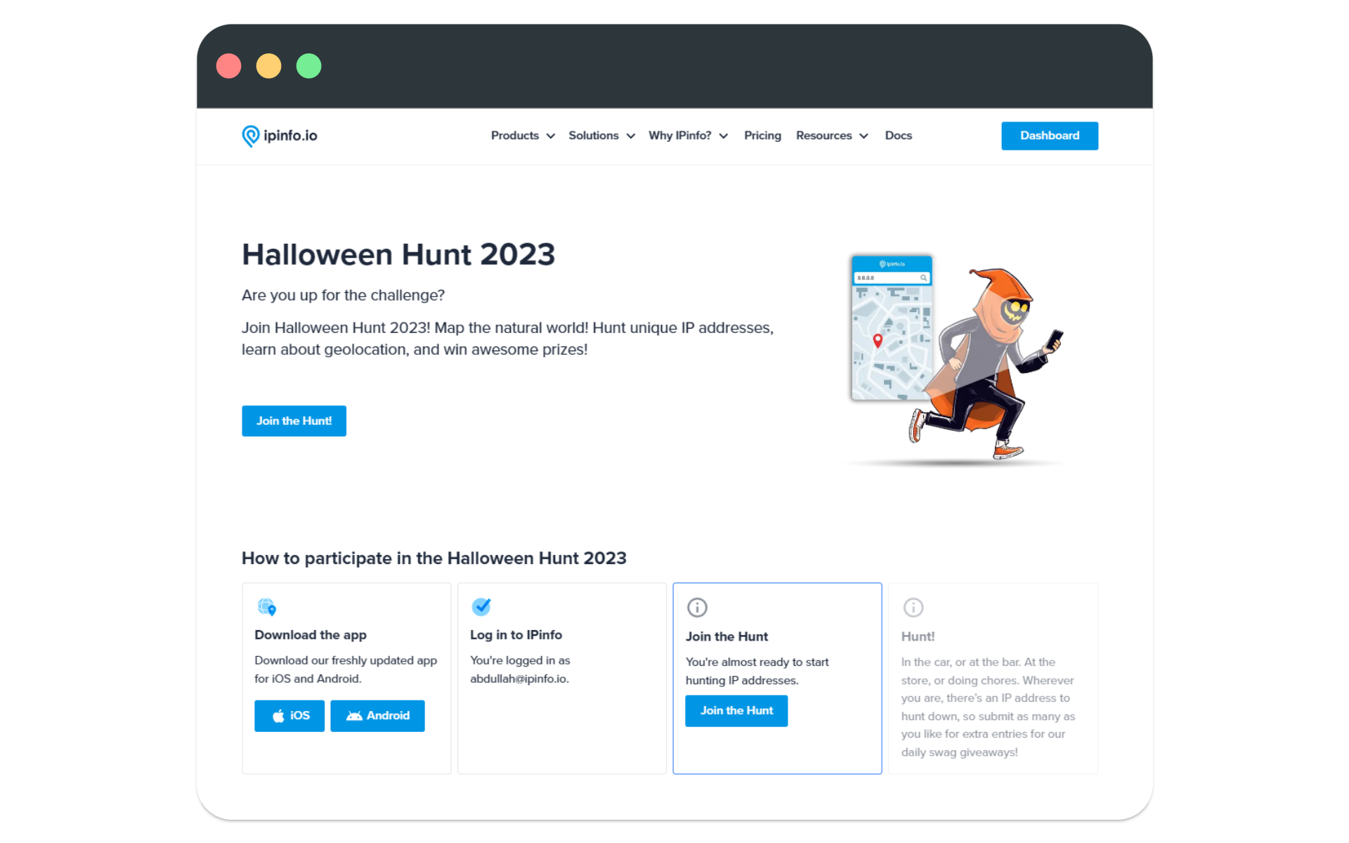 Once your IPinfo account is ready, visit **Halloween Hunt 2023 - IPinfo.io.** Then select “Join the Hunt”.