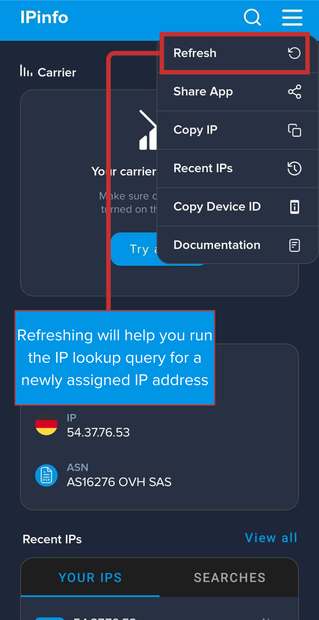 First, connect to the Internet. Any public connection, such as WiFi, mobile, home, or otherwise is valid, as long as it provides you with a unique public IP address, it is fair game. Once you are assigned an IP address, open up the IPinfo app and hit refresh. And that’s it.