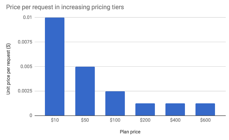 My hypothesis was that the distribution across tiers would be skewed to the less expensive plans — that more hobbyist developers would use the API to create an MVP for their side-projects.