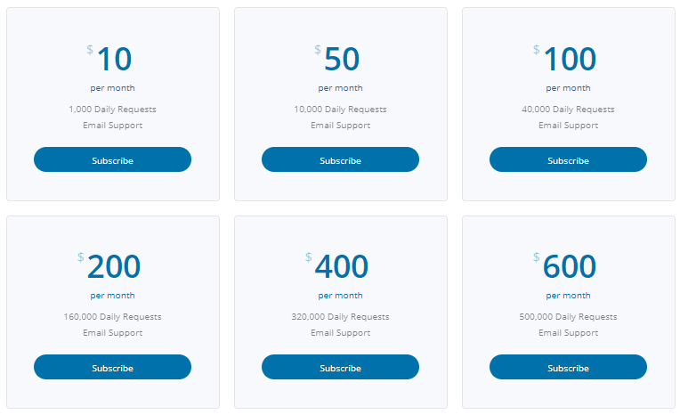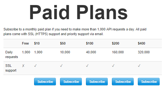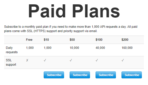 I created four tiers to start: $10, $50, $100, and $200. The $10 tier was meant to capture developers who are working on a side project, but, perhaps, are starting to dedicate more time and resources to getting it up and running. The $200 tier was meant to capture businesses that require this API as an integral part of their application.