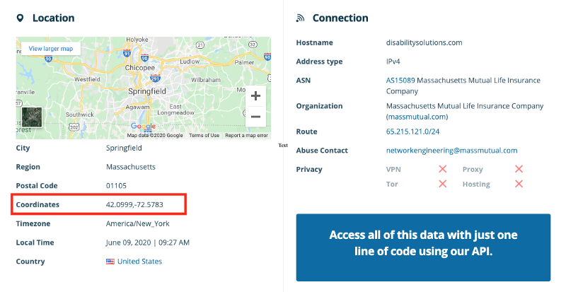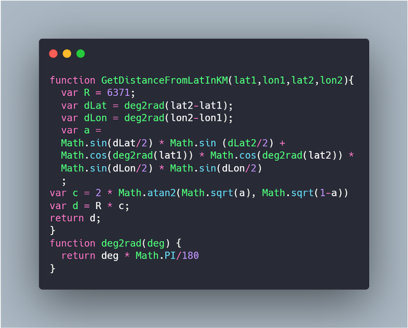 Note: The following methods require you to have both point’s coordinates. You can effortlessly acquire the latitude and longitude of your visitor’s IP addresses by using IPinfo’s Geolocation API.