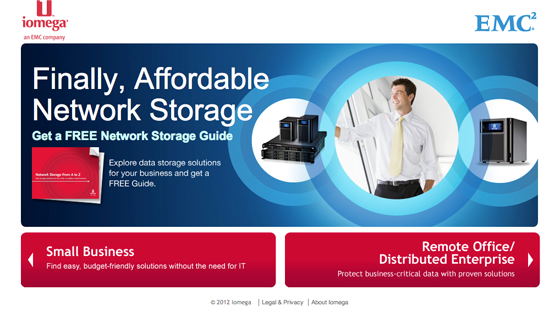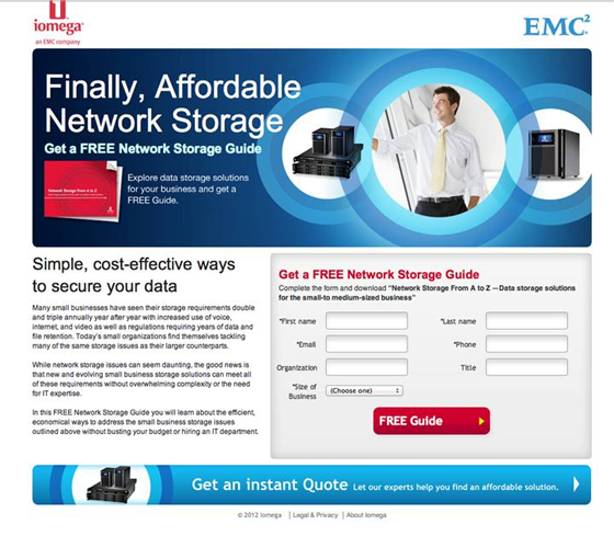 This page fails nearly across the board in personalization. Aside from obviously targeting people interested in storage, this landing page doesn’t differentiate for any other kind of customer. There is some oddly placed information about data security and an offer for a free network storage guide, but the viewer has no sense that iomega knows who they are, what they want, and how it can meet that need.