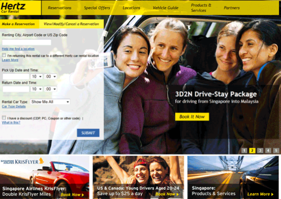 The Singapore page makes a comparably positive first impression; by featuring an incentive offered by the country’s national airlines, Hertz shows its viewers that it is deeply invested in improving their lives on a more localized scale and in fostering relationships with Singapore business.