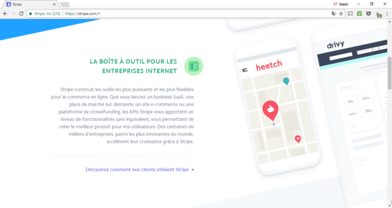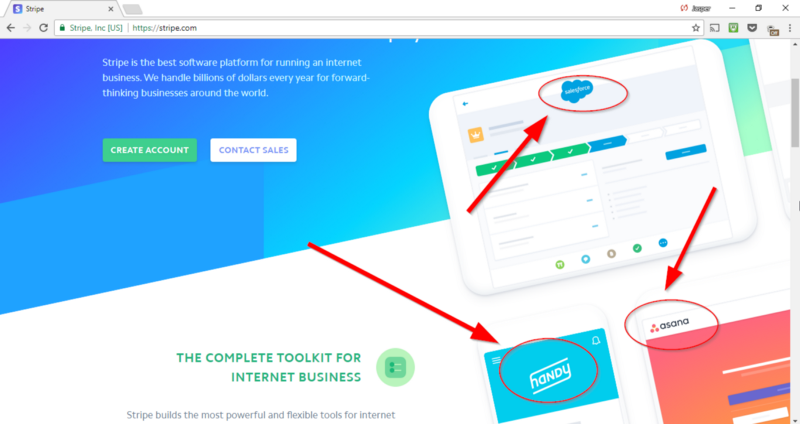 If you navigate to Stripe’s homepage, one of the first things you see is the claim that they’re “the complete toolkit for internet business,” and the brand names to prove it — Salesforce, Asana, and Handy are sprinkled across the floating monitors in their design: