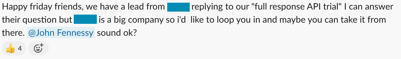 For instance, in our sales department, sometimes a team member simply needs to let the other members know that they’re running point with a sales inquiry. Here’s a great example of this exact scenario.