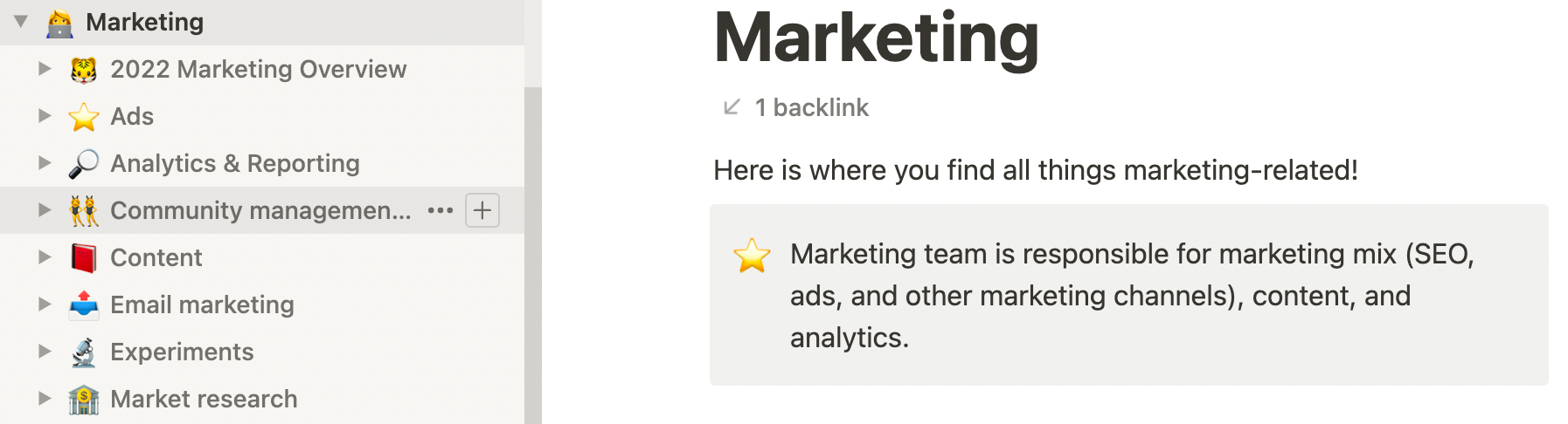 We also use Notion to keep track of important tools or processes that each team uses. For instance, the marketing team has its own set of folders that include categories such as these: