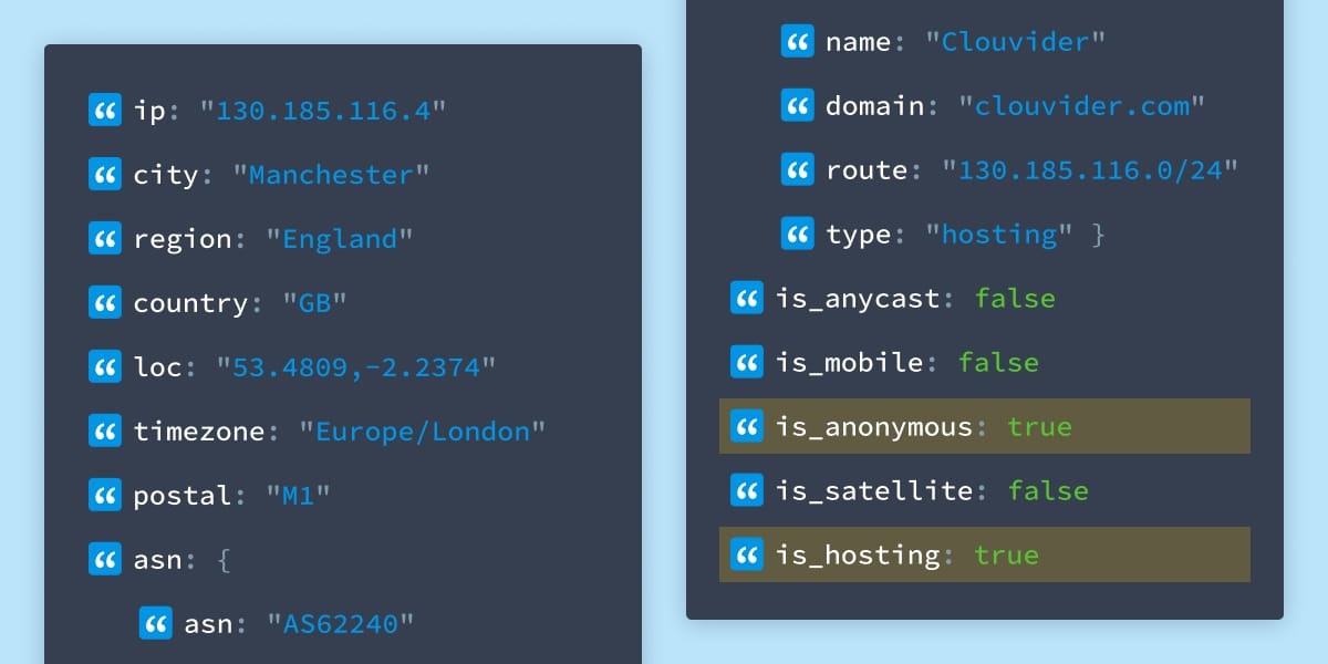IPinfo Core transforms raw IP addresses into actionable intelligence with city-level precision and 5 new context flags. Know exactly what type of IP you're dealing with — whether it's a VPN, mobile carrier, hosting, anycast, or satellite connection.
