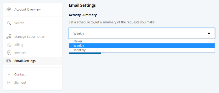 To configure when you’ll receive your request summary emails, log in to your IPinfo account and click the Email Settings link on the menu to the left. On this page, you’ll be able to select to receive these emails weekly, monthly, or disable them completely.