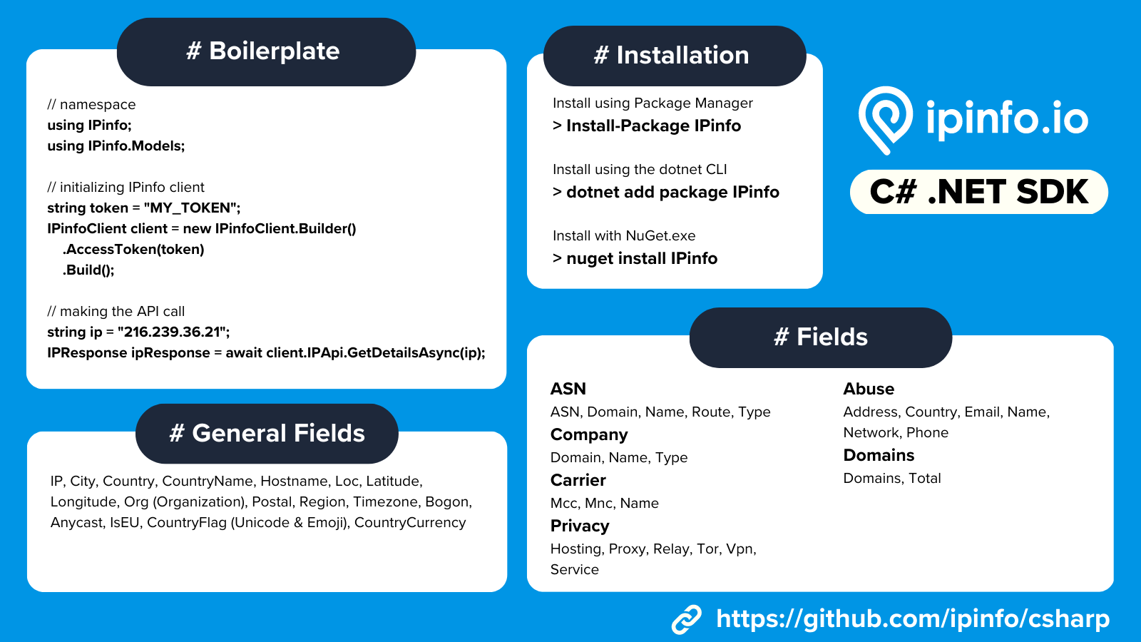 If you want to integrate IPinfo’s API service and data in your .NET application using the C# language, you should use the IPinfo C# / .NET SDK. You can use the IPinfo API service using the HTTP client library. However, our official open-source SDK makes using our data more simplified and it comes with some additional helpful features.