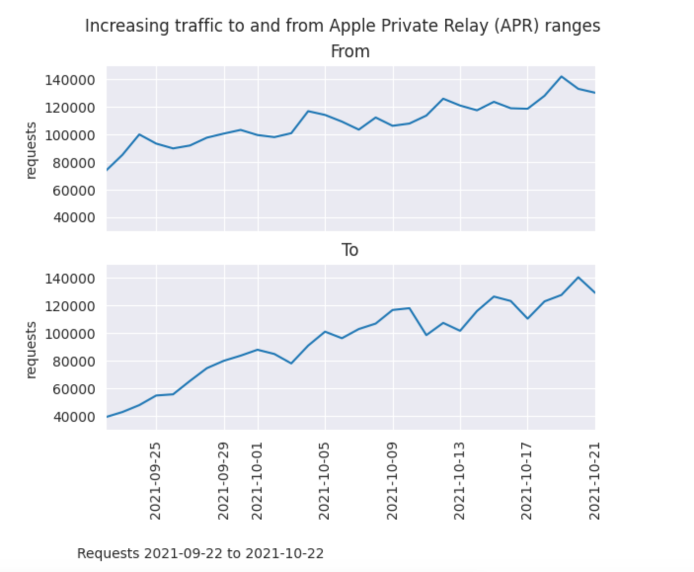 "Apple Private Relay".As was mentioned above, we've noticed a steady growth in APR users since Apple launched this feature in the fall of 2021. Assuming the ranges have remained the same, we've noticed an increased amount of traffic from Private Relay as represented by these graphs.