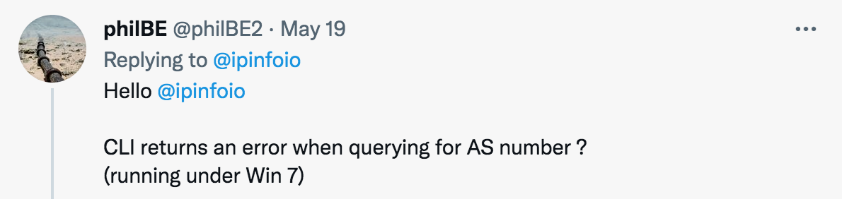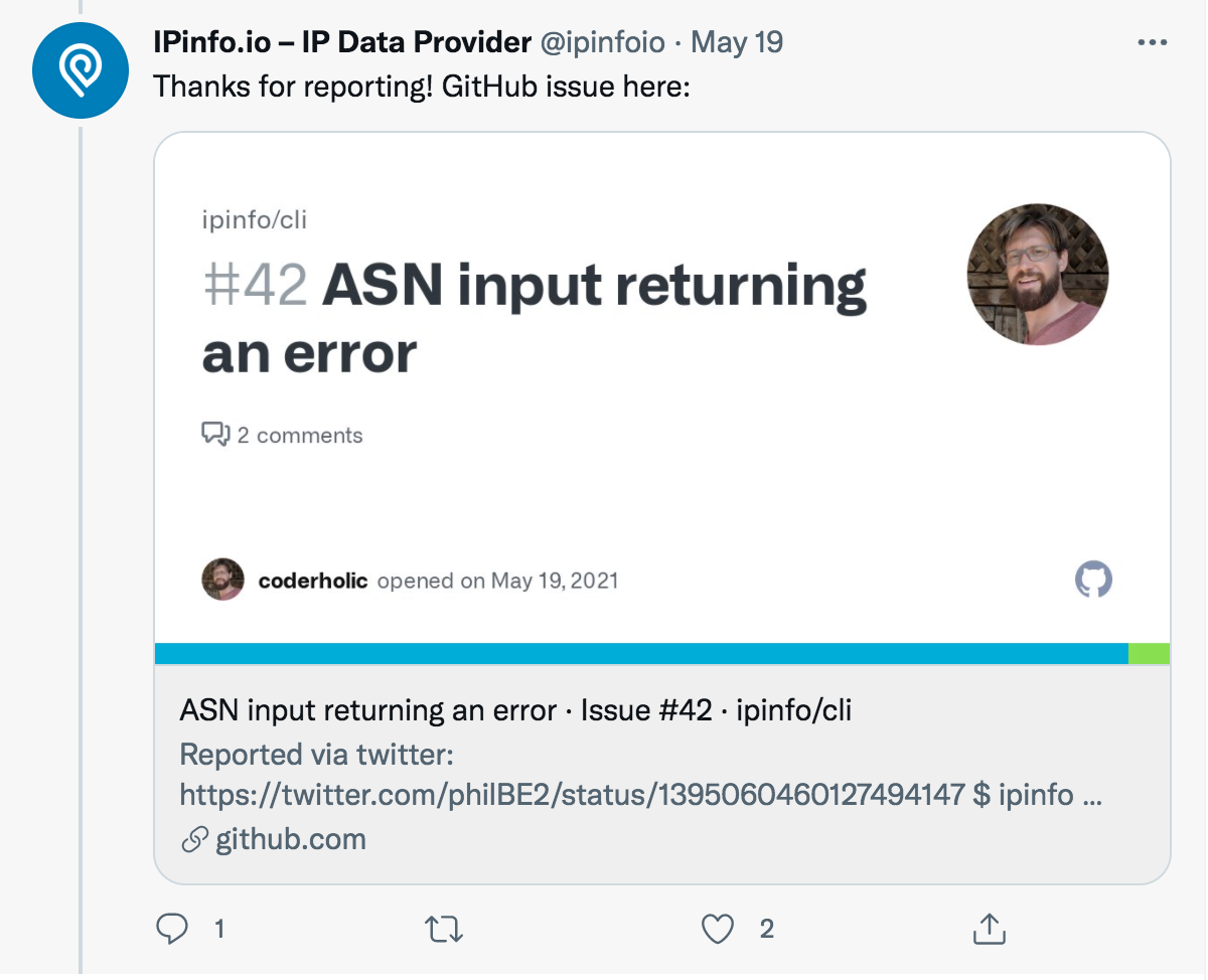 This user gave feedback on May 19, and the IPinfo team gave an answer on GitHub that same day. (Side note: one of the perks of this application is that we can offer better support while improving our CLI based on user feedback.)