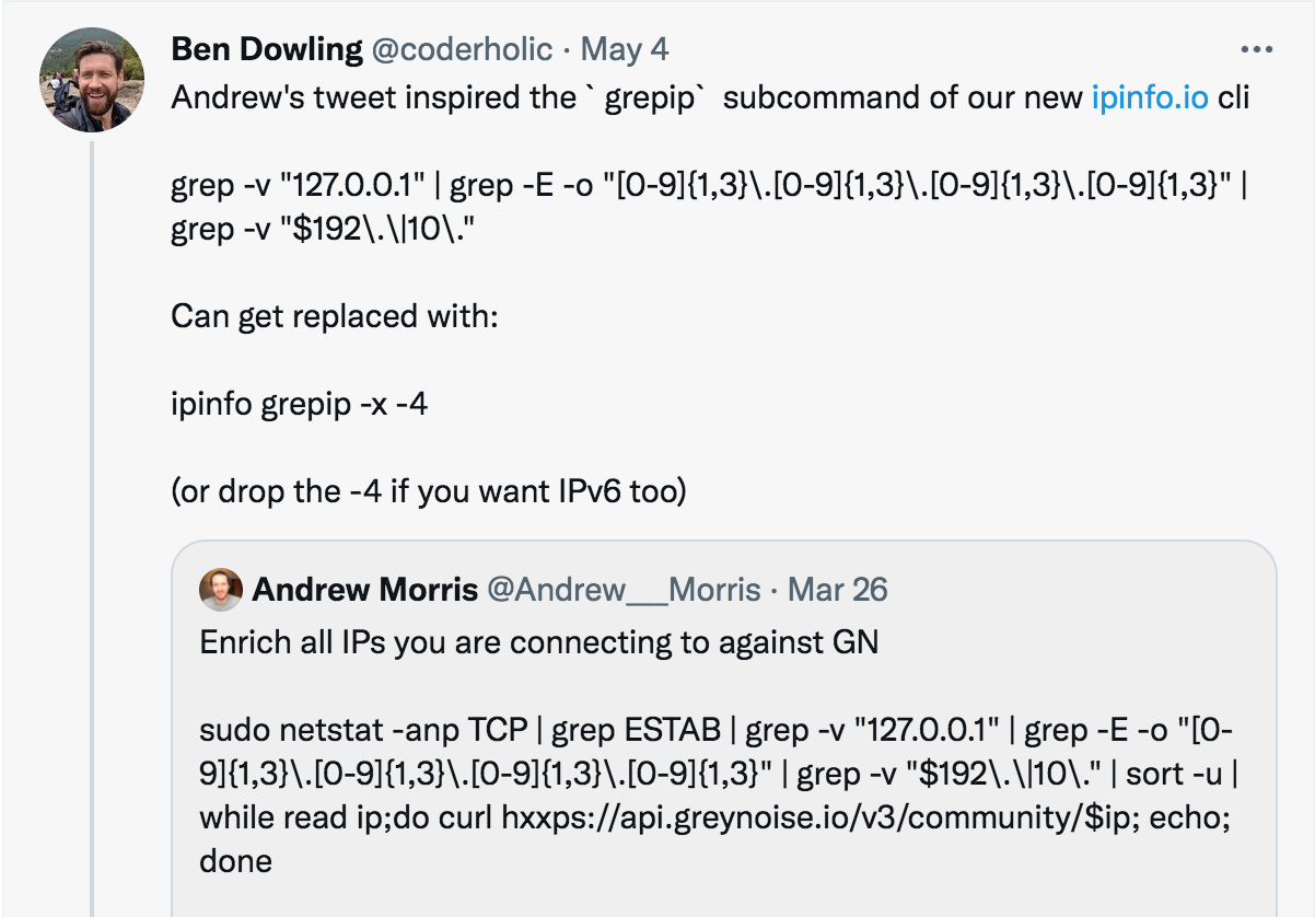 From a developer perspective, grepip is often a better answer than raw grep because it filters more reliably and has options to ignore or include bogon IPs which would be almost impossible with just grep - Uman Shahzad, IPinfo