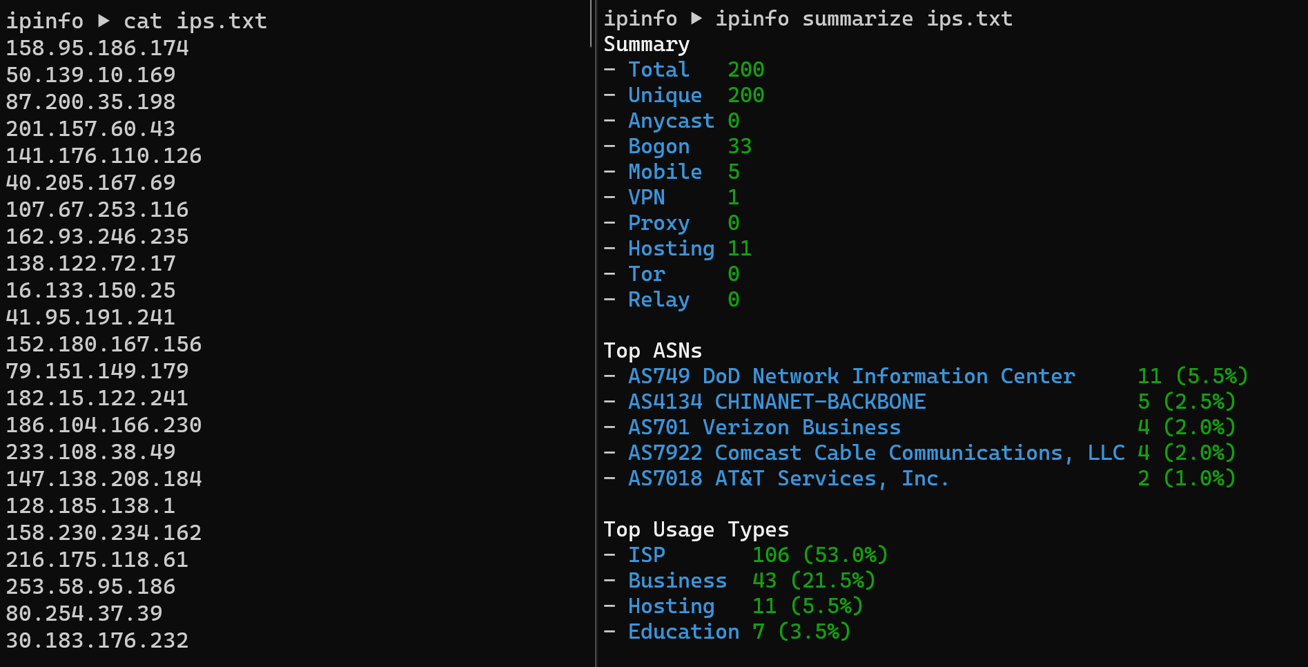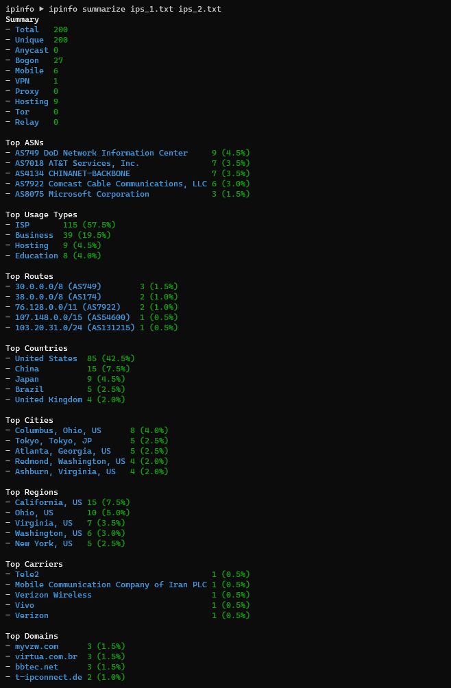 The summarize command summarizes IP address information from a list of IP addresses. This allows you to get a summary result that contains geolocation data, ASN data, privacy detection (aka anonymous data), mobile carrier data and more, in a report-like format that can even be outputted as a JSON file.