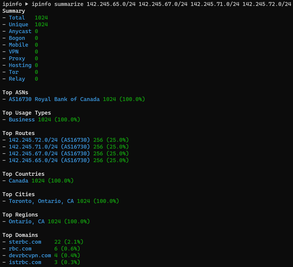 ipinfo summarize 142.245.65.0/24 142.245.67.0/24 142.245.71.0/24 142.245.72.0/24