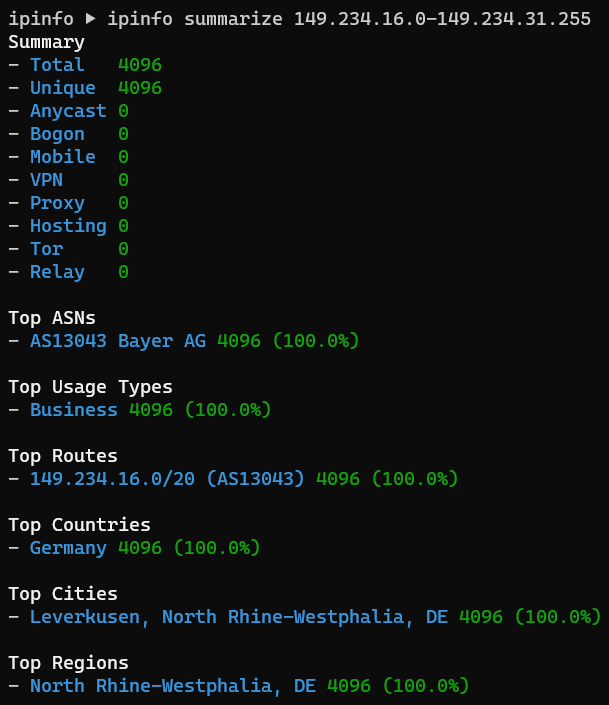 ipinfo summarize 149.234.16.0-149.234.31.255