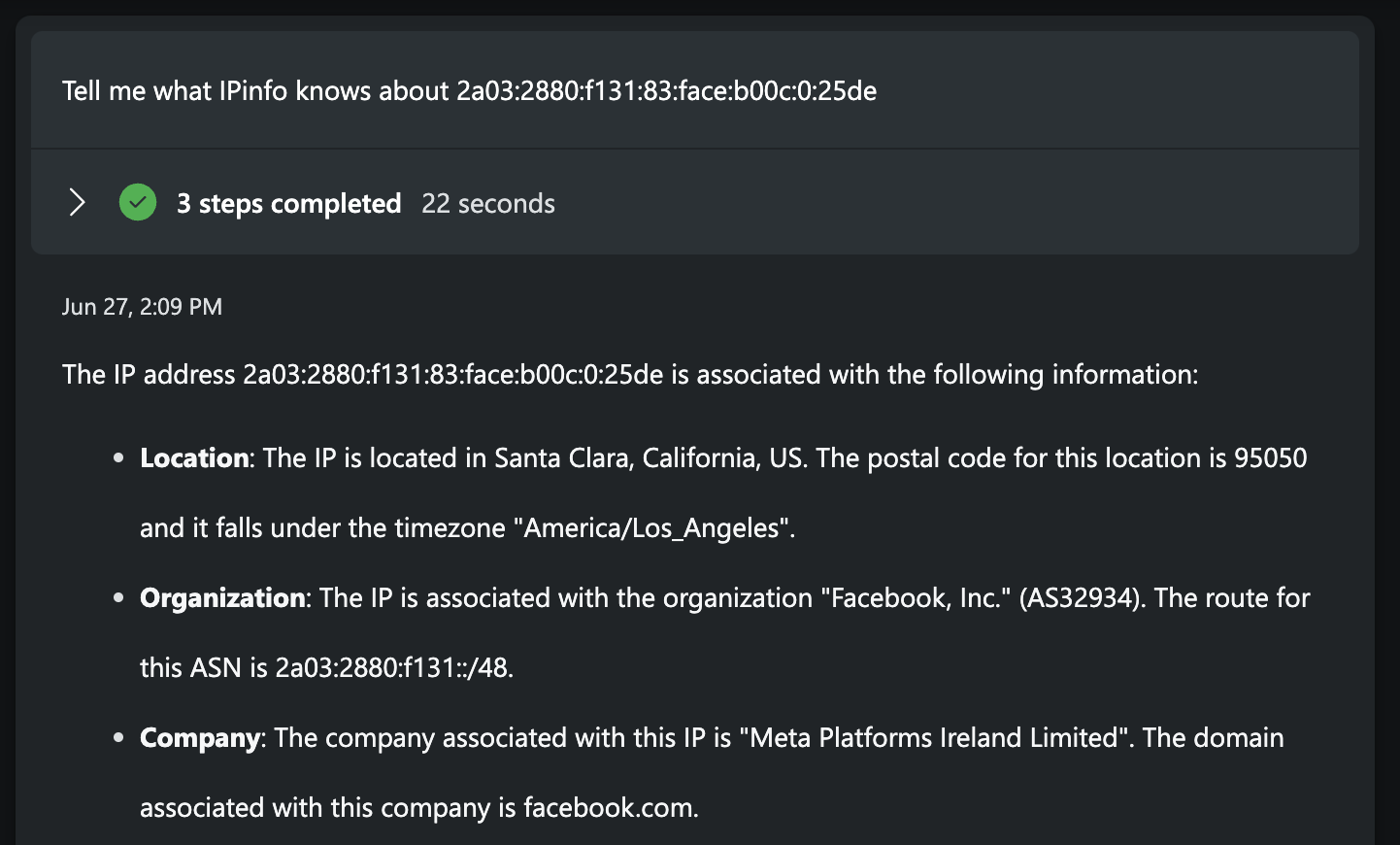 That’s all there is to it! You can now use natural language prompts to query the IPinfo API using Copilot. Below are some suggested prompt elements to use (underlined text) to ensure IPinfo data is queried: