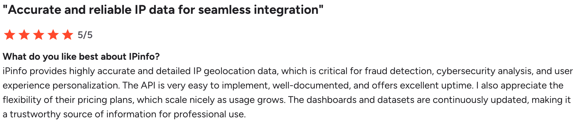 Speed consistently comes up first.Multiple reviewers highlighted the performance of our API, particularly in environments where they’re scanning large volumes of IPs or enriching traffic data in real time.