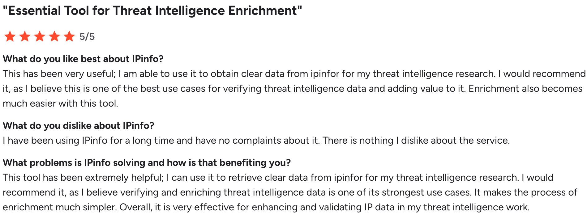 Threat intelligence enrichment is a strong use case.Security practitioners described IPinfo as an essential enrichment layer for validating and adding context to threat intelligence data.
