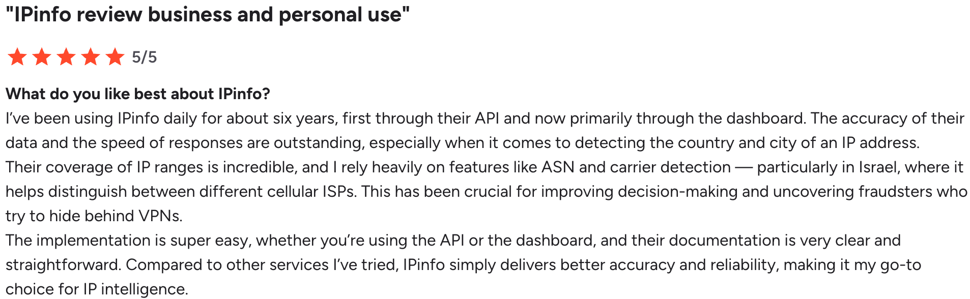 Accuracy and reliability remain core expectations.Reviewers describe the data as accurate, reliable, and up to date, particularly when enriching IPs with location, ASN, and company information.