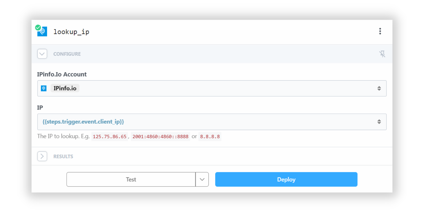 After you have passed your IPinfo token information, provide the IP address information field. You can select the field that contains the client's IP data. In this case, it is {{steps.trigger.event.client_ip}}.