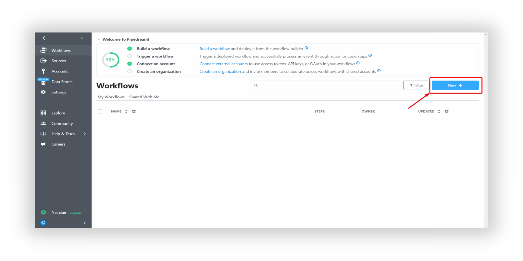 Get started by creating a workflow from your Pipedream account: https://pipedream.com/workflows