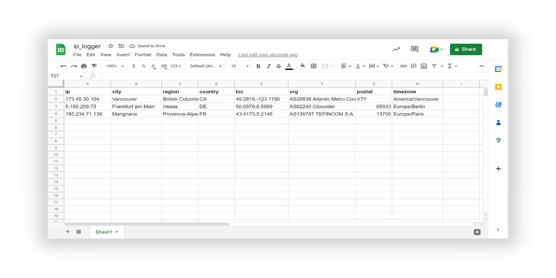 And every time anyone visits your IP logger URL, their IP address and geolocation information will be logged in your Google Sheets document.