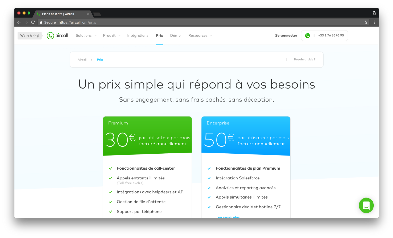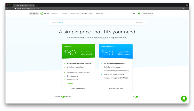 Aircall allows you to set up a virtual call center. Do so in the U.S. and you’ll get this pricing page: