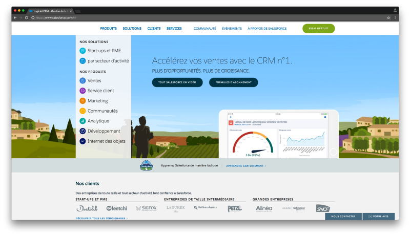 A fairly regular landing page for a SaaS marketing site. The value prop and hero image are loud and clear, then the page links out to more about the products and services Salesforce offers. Let’s look at the same page from France: