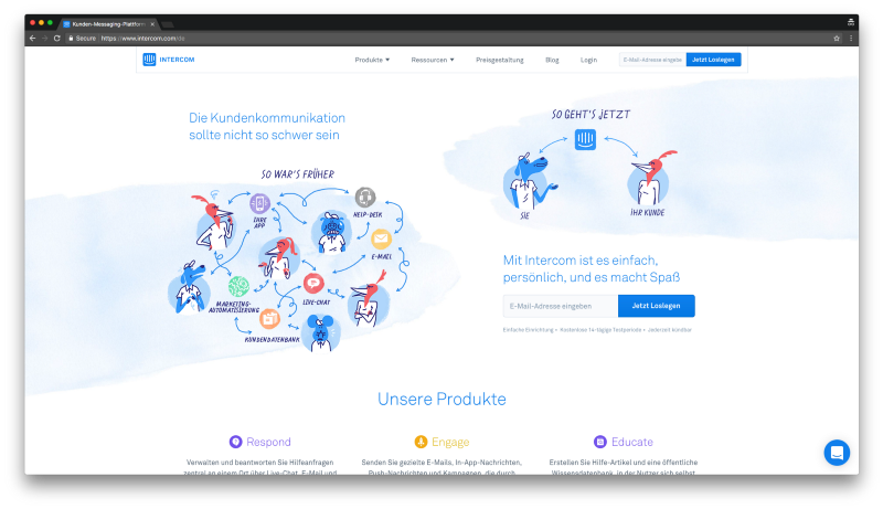 These pages still each say the same thing. “Communiquer avec les clients ne devrait pas etre aussi difficile” and “Die Kundenkommunikation solite nicht so schwer sein” both mean “Communicating with customers shouldn’t be this hard.” All they have done is translated their value prop and copy. The cartoons have also changed a little, but that’s it.
