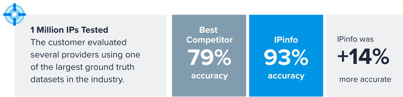 Even under these constraints, IPinfo achieved 93% accuracy compared to 79% from their existing provider: a 14 percentage point improvement. The results demonstrated that our classification approach outperforms our competitors even when IPinfo's unique measurement capabilities are removed from the equation.