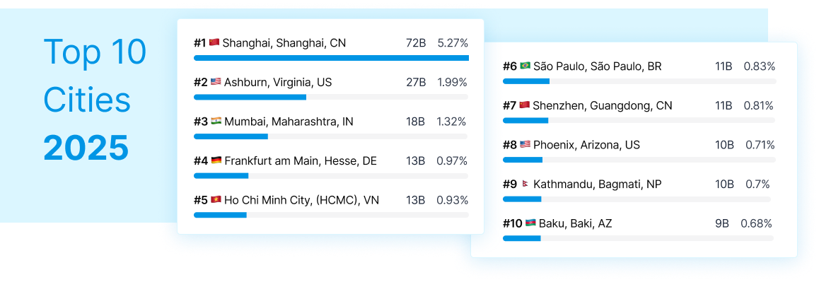At the city level, the same pattern holds. Shanghai-based IPs led with 72.4B lookups (5.27%), making it the most frequently queried city globally. Ashburn, Virginia (1.99%), a major data center hub, ranked second, demonstrating that infrastructure locations are analyzed as heavily as population centers. Cities such as Mumbai (1.32%), Frankfurt (0.97%), and Ho Chi Minh City (0.93%) further show that IP intelligence demand spans financial hubs, cloud infrastructure centers, and fast-growing urban regions.