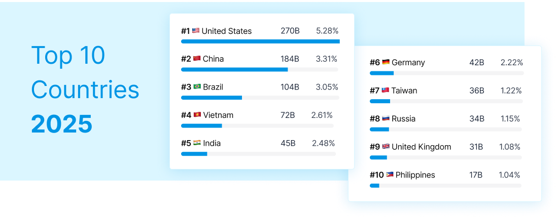 At the country level, IPs located in the United States were queried most frequently, with 270.5B lookups (5.28%), reflecting the country’s central role in global internet infrastructure. China-based IPs followed at 183.8B (3.31%), indicating sustained scrutiny of traffic originating from the region. Brazil (3.05%), Vietnam (2.61%), and India (2.48%) rounded out the top five, highlighting growing digital ecosystems where traffic classification and validation are increasingly important.