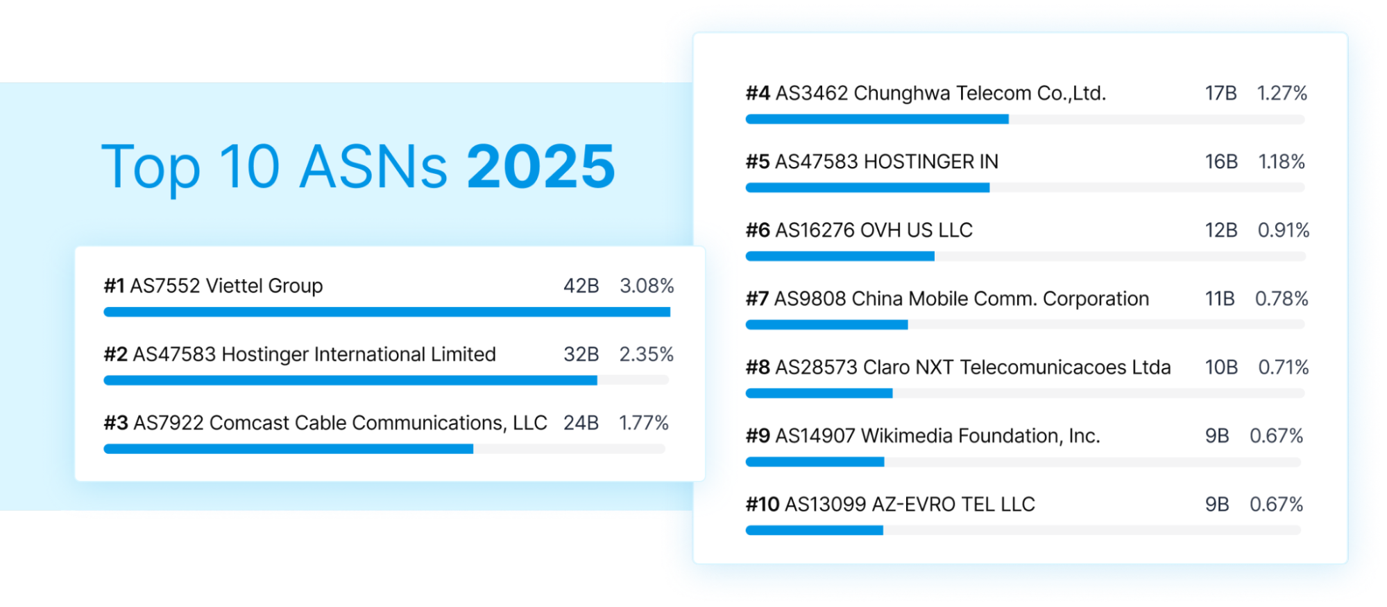 Beyond individual leaders, the Top 10 ASN ranking reveals a clear structural pattern in how IP intelligence is used globally. The list splits almost evenly between large national ISPs (Viettel, Comcast, China Mobile, Claro) and global or regional hosting providers (Hostinger, OVH, AZ-EVRO), highlighting two dominant demand drivers: consumer-scale traffic analysis and infrastructure-level risk assessment.