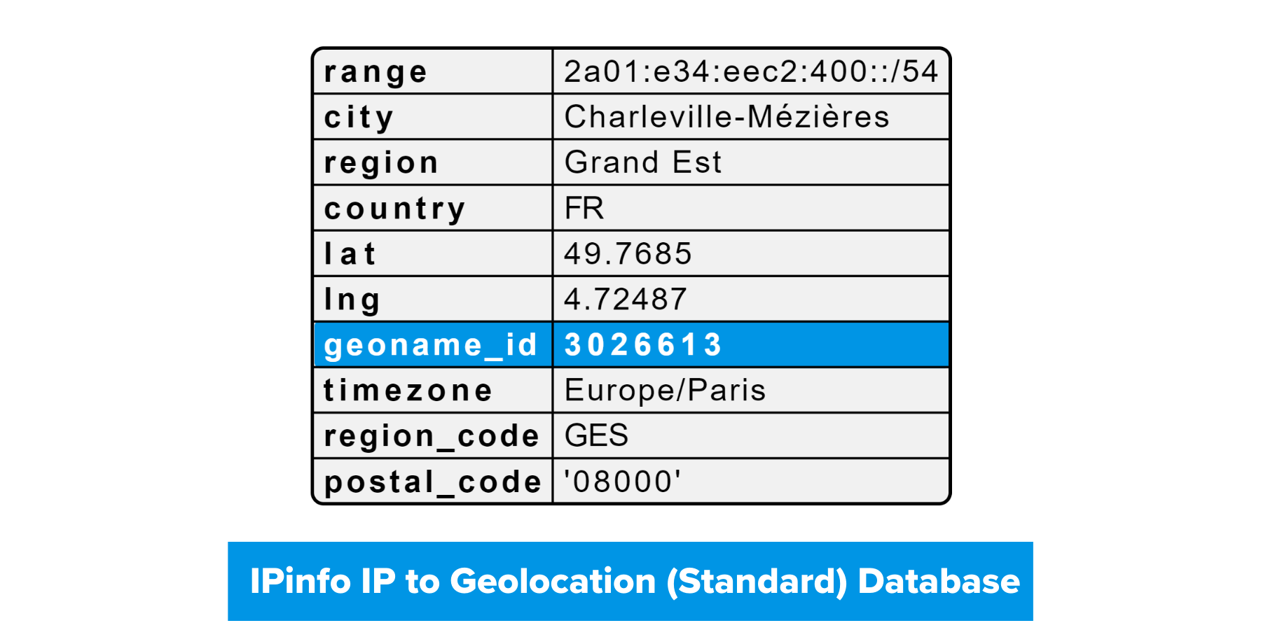 Now by combining the two databases you get the full picture of IP geolocation information. Which involves first looking up the IP address on IPv4 and IPv6 databases. Taking that geoname_id column, then looking up that value on the location database.