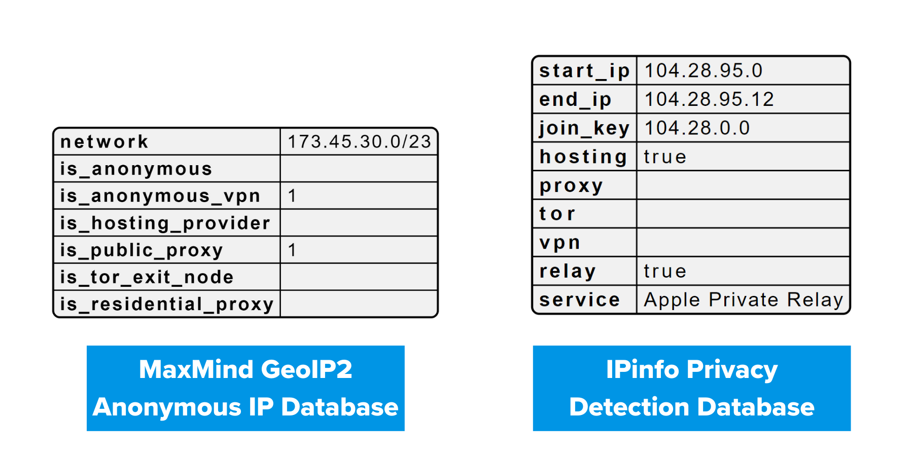 When switching from MaxMind’s GeoIP2 Anonymous IP database, you get the extra Apple Relay detection service with us. One thing to note about the structure is that MaxMind uses 1 or blank to flag the identification of services, whereas we use true or blank.