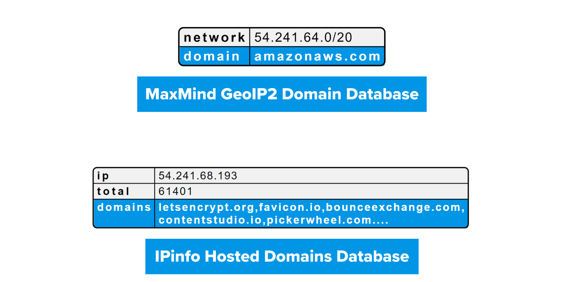 | - | GeoIP2 Domains Database | IPinfo Hosted Domains Database |