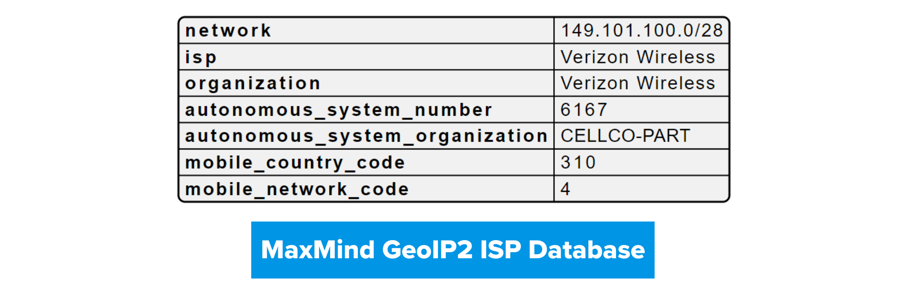 The GeoIP2 ISP database provides the organization name, ASN, Mobile Country Code (if available), and Mobile Network Code (if available).
