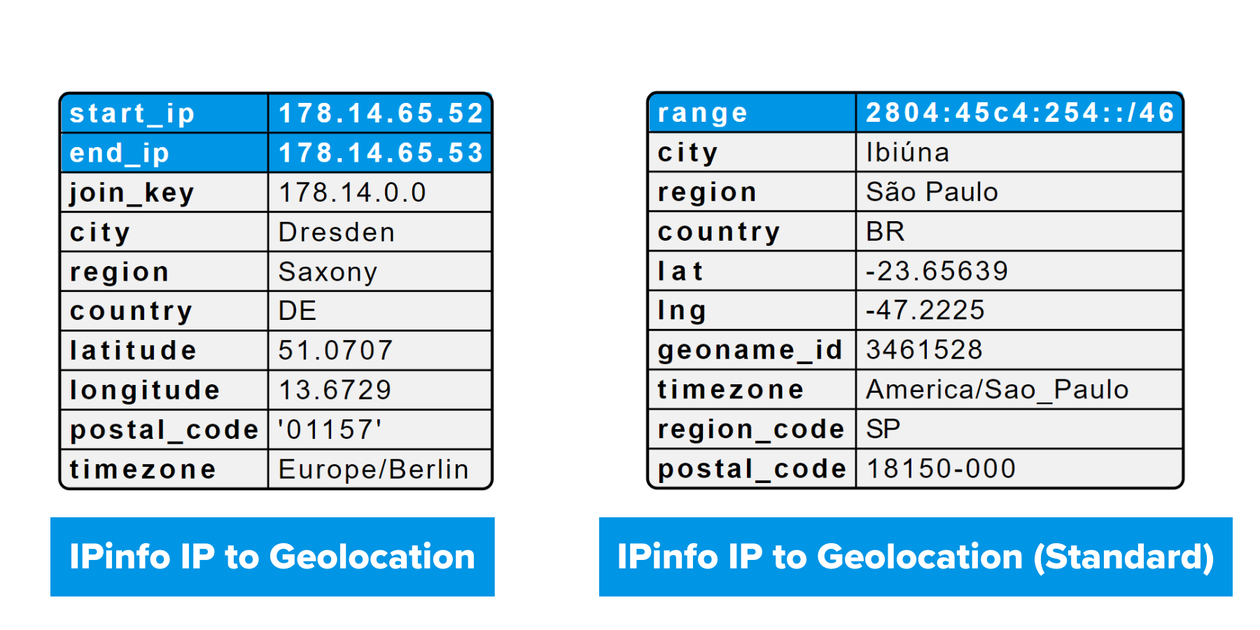 MaxMind’s GeoLite2 and GeoIP databases are their IP to geolocation database that provides geolocation insights from IP addresses. The question is how it differs from our IP to location database. An issue with MaxMind’s database offering is that their adherence to the nested data format, while IPinfo’s datasets are flat and tabular. Our flat/tabular structure makes data queries easier and more efficient, making data ingestion straightforward.